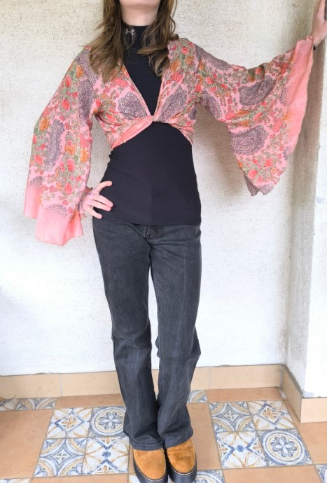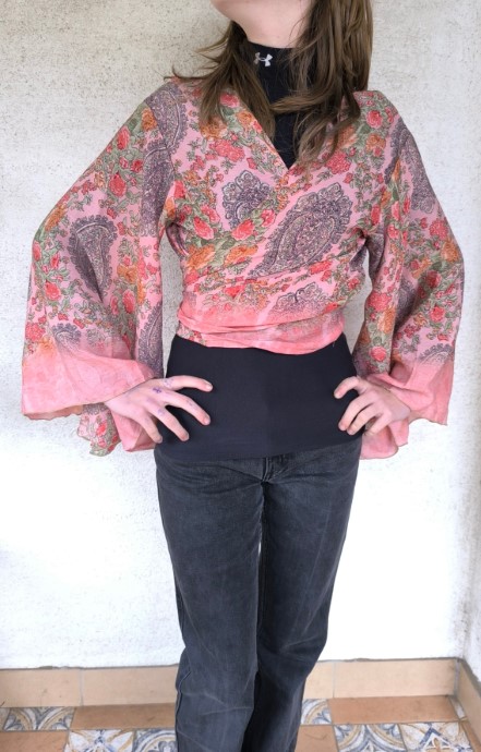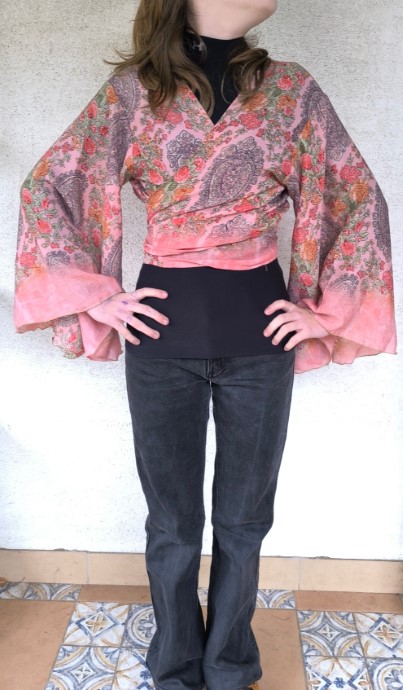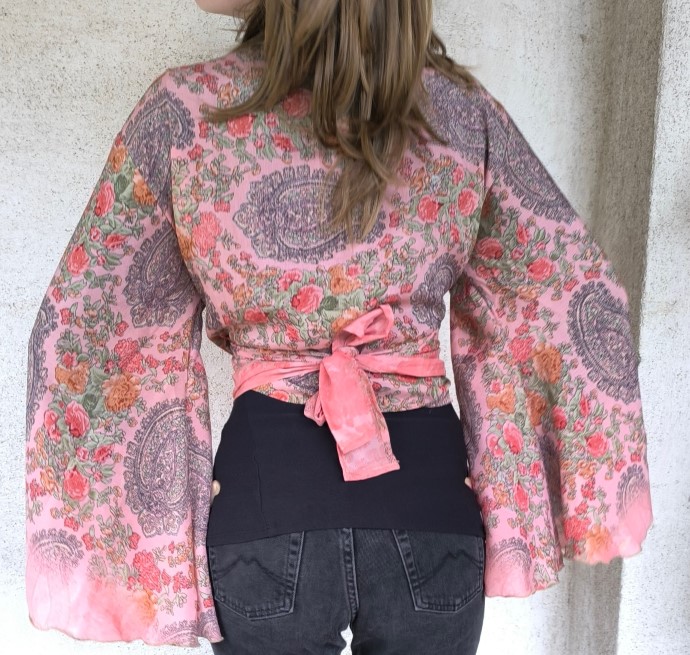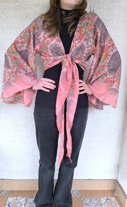 Átlapolós felsőink vintage száriból készültek. Mivel újrafelhasznált kézzel készültek, így mindegyikből egy darab készül.