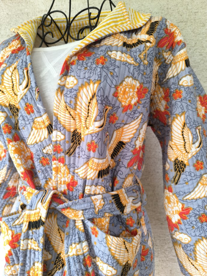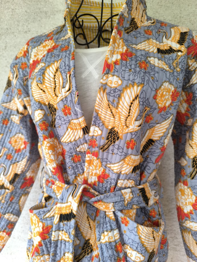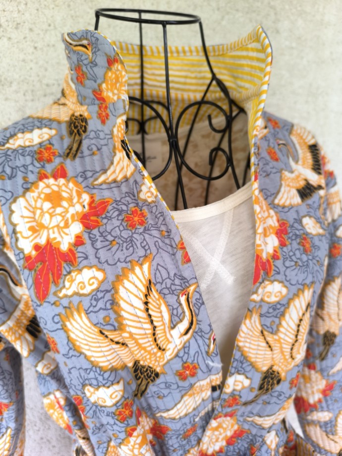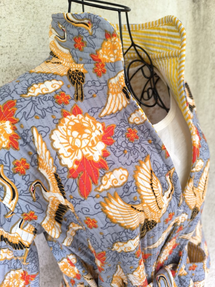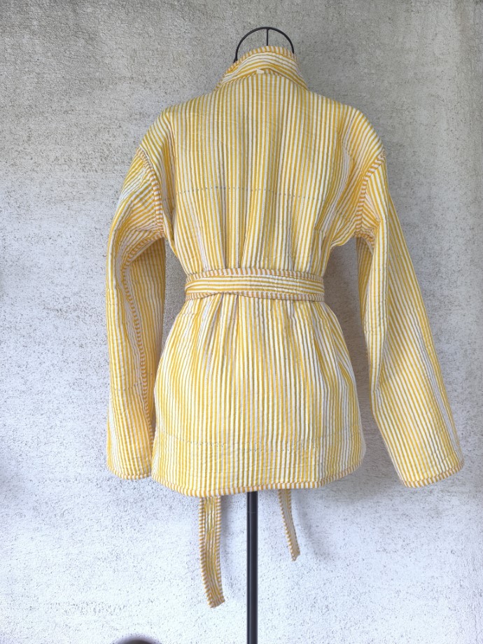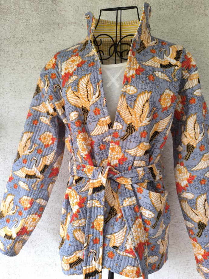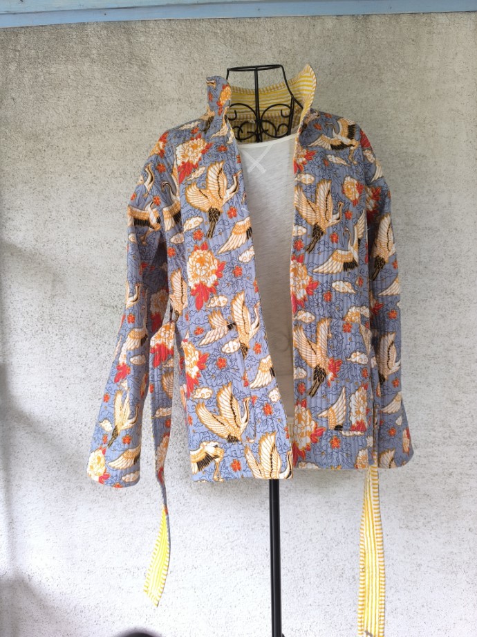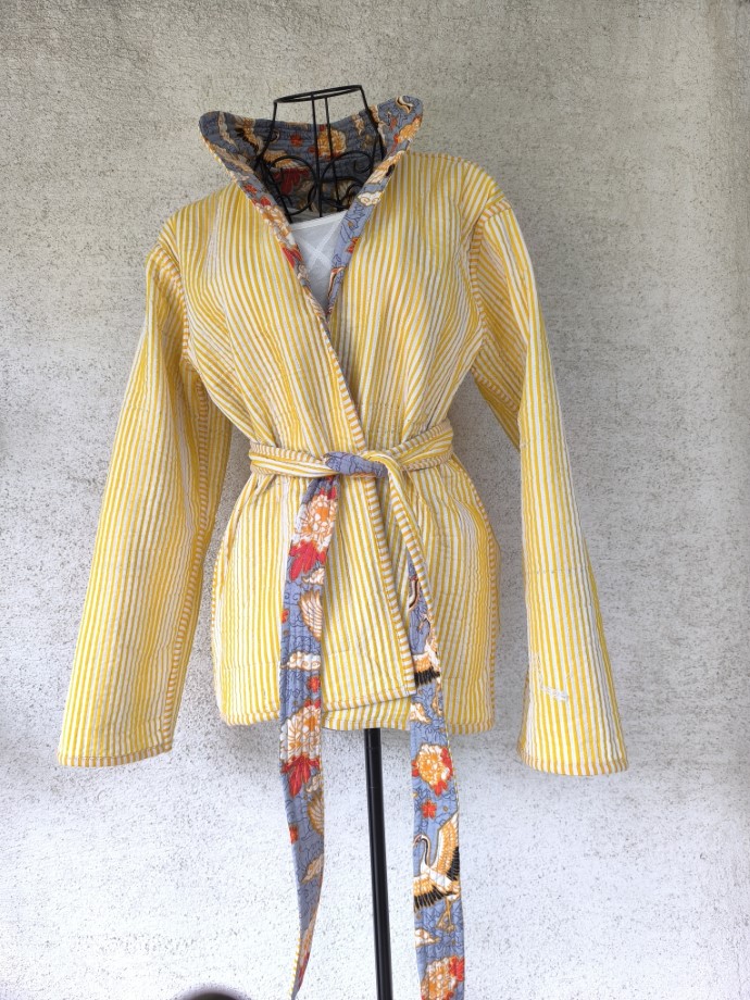 Kifordítható egyenes szabású, steppelt pamutvászonból készült, derékban megkötős átmeneti kabátka. Őszre, tavaszra, irodába és még megannyi helyre tökéletes viselet. Nagyon kellemes, könnyű jellegzetes indiai zsebes kiskabát. Egyedi, kézi készítésű.