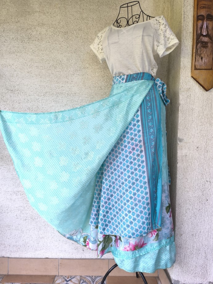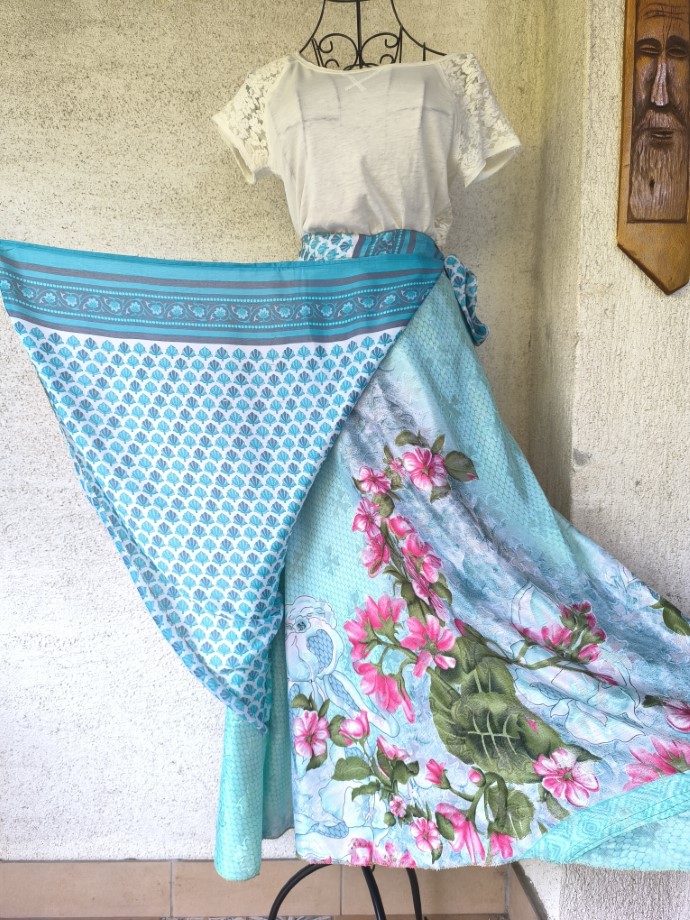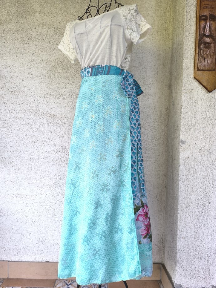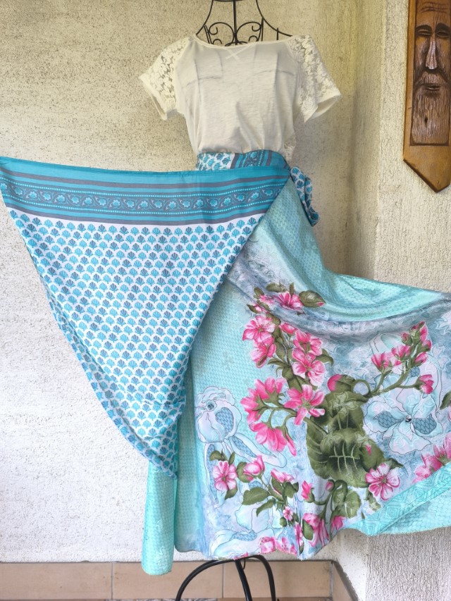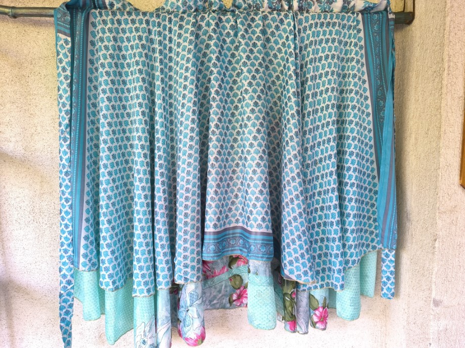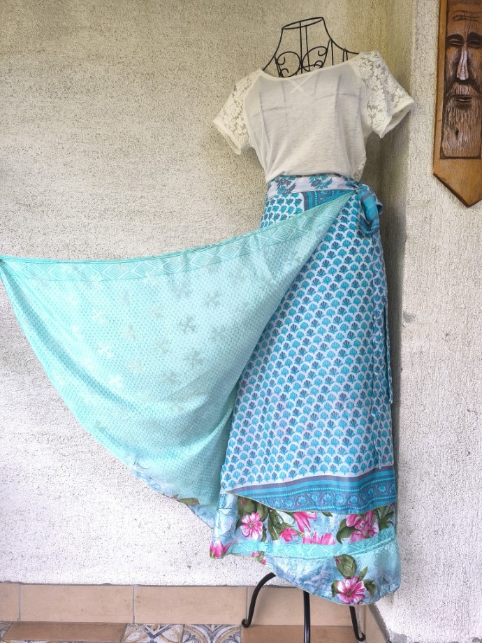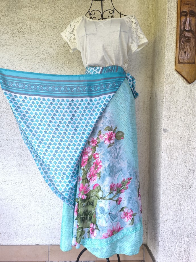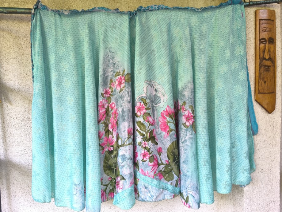 Mindkét oldala hordható, kézzel készített darabok. Felköthető szoknyának vagy ruhának.