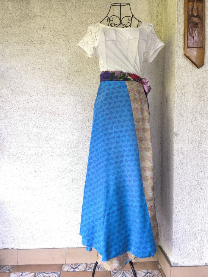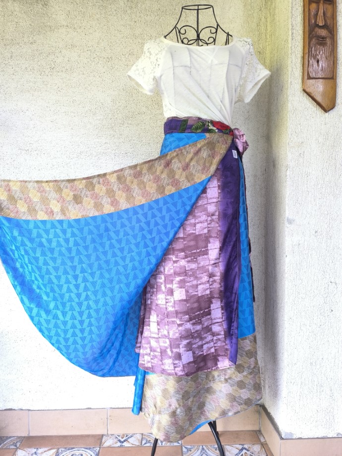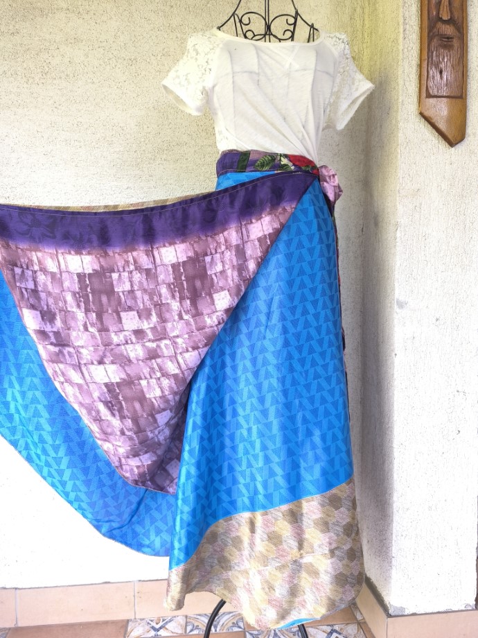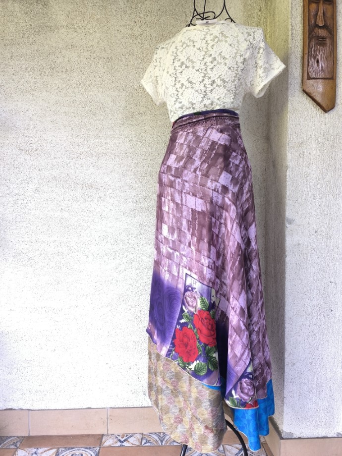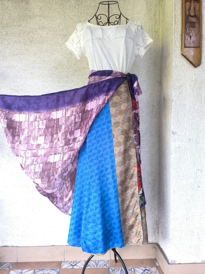 Szári szoknyáink újrahasznosított szárikból készülnek. Mindkét oldaluk hordható, kézzel készített darabok. Felköthetőek szoknyának vagy ruhának is.