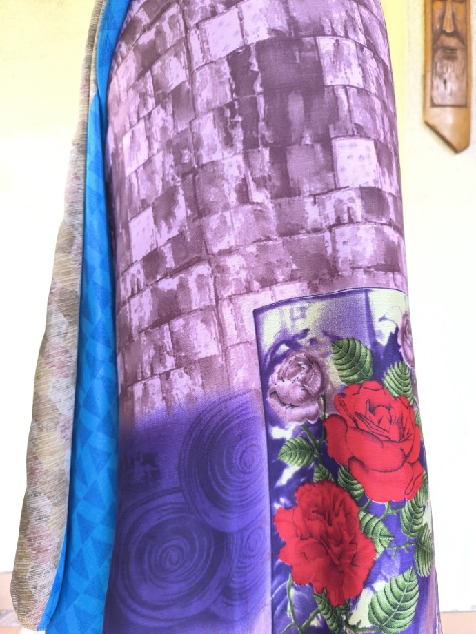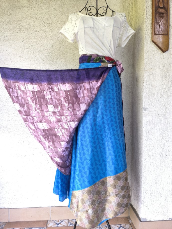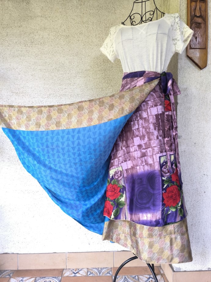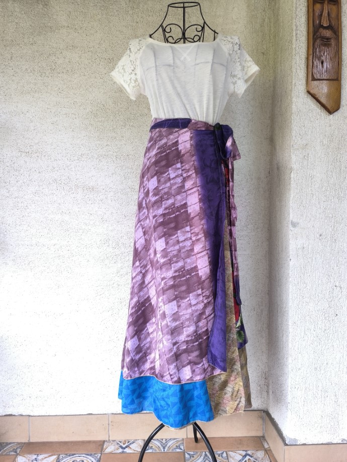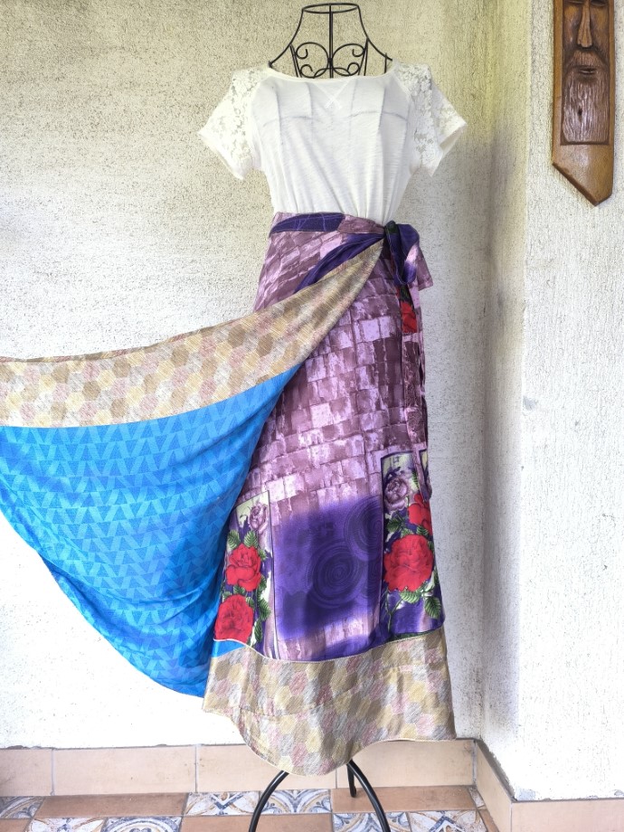 Szári szoknyáink újrahasznosított szárikból készülnek. Mindkét oldaluk hordható, kézzel készített darabok. Felköthetőek szoknyának vagy ruhának is.