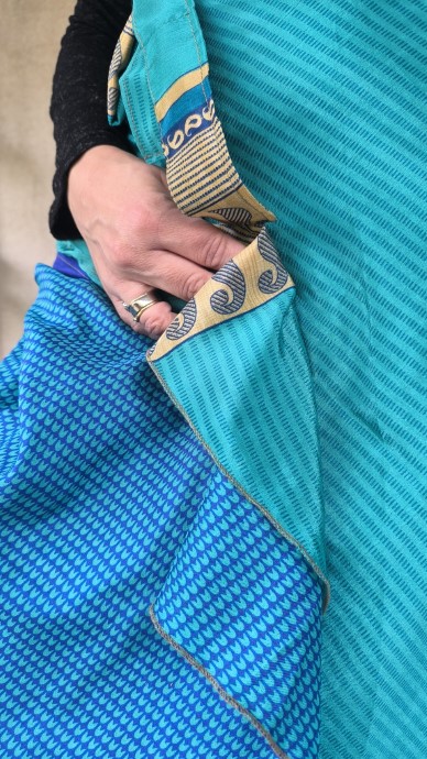 Mindkét oldala hordható, kézzel készített darabok. Felköthető szoknyának vagy ruhának.