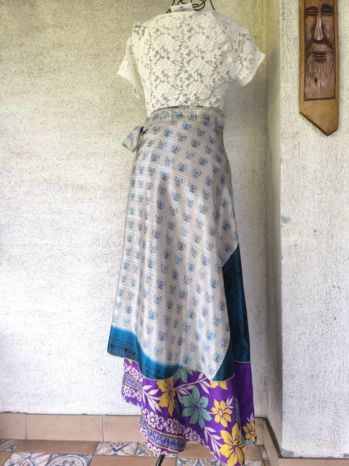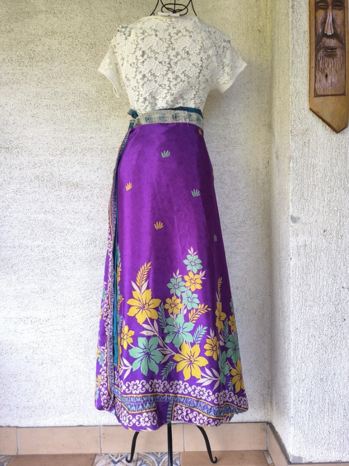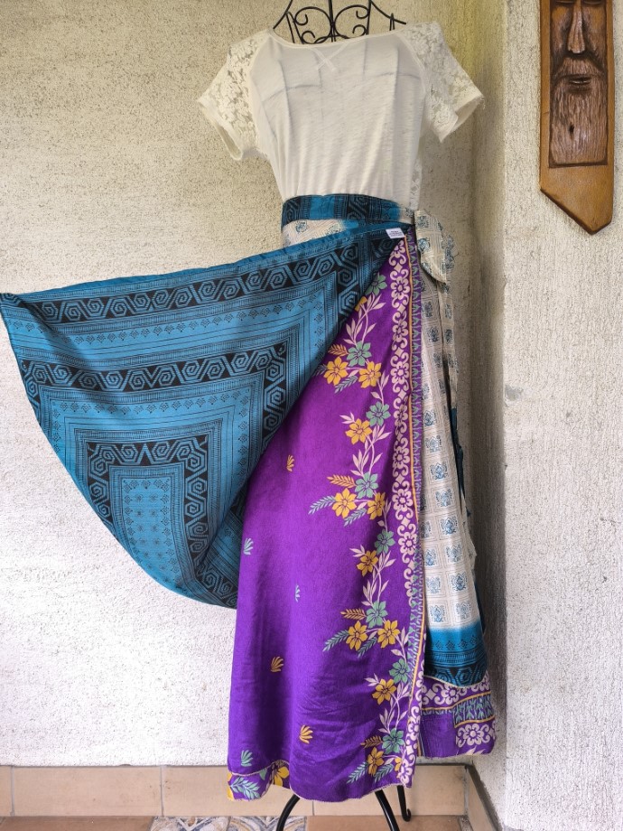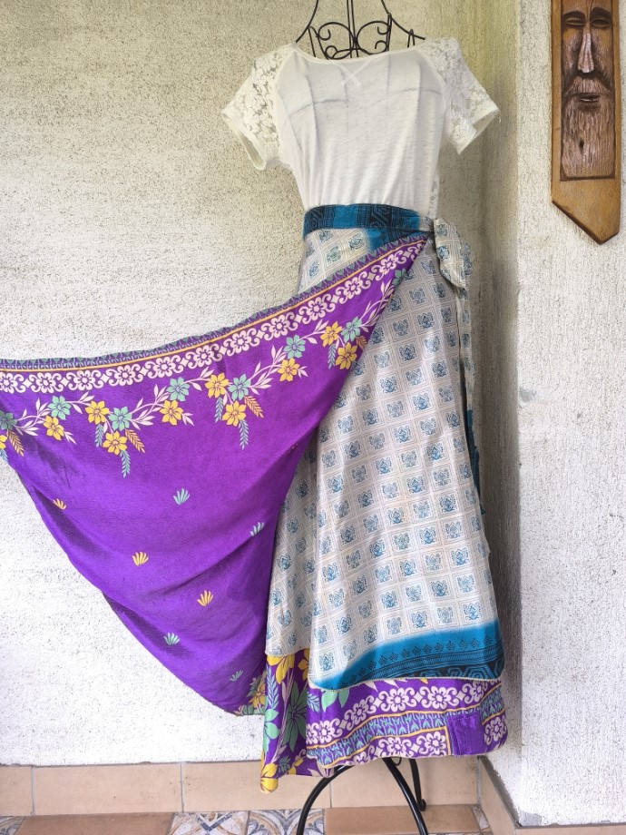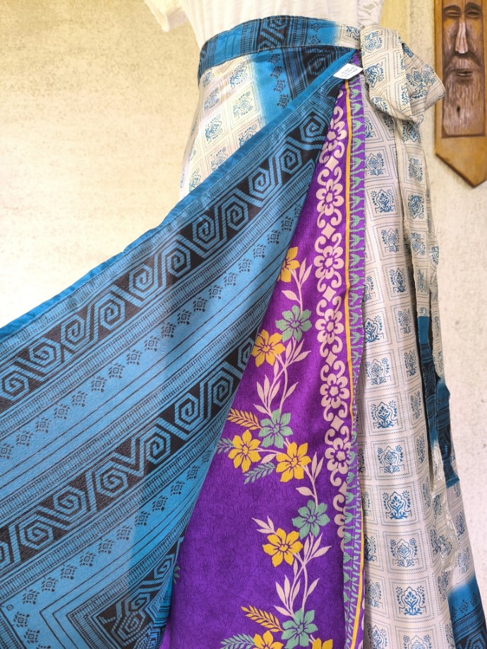 Szári szoknyáink újrahasznosított szárikból készülnek. Mindkét oldaluk hordható, kézzel készített darabok. Felköthetőek szoknyának vagy ruhának is.