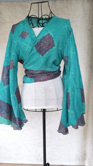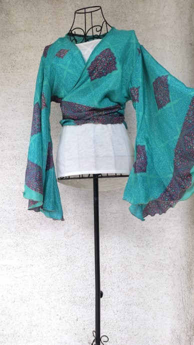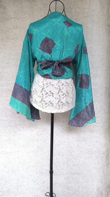 Átlapolós felsőink vintage száriból készültek. Mivel újrafelhasznált kézzel készültek, így mindegyikből egy darab készül.