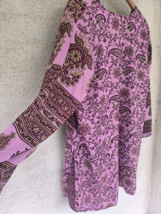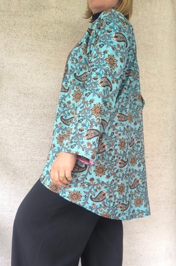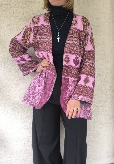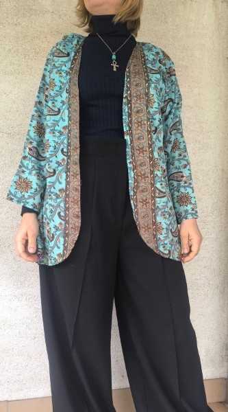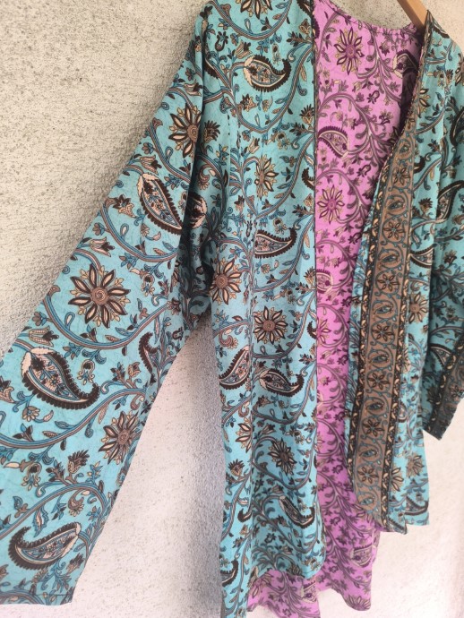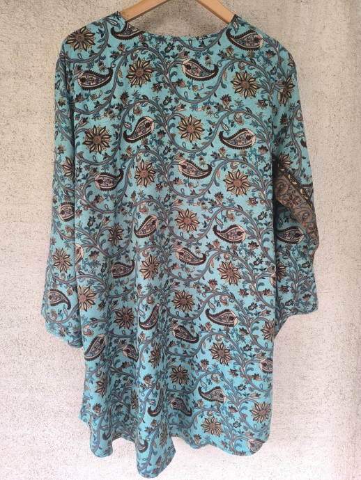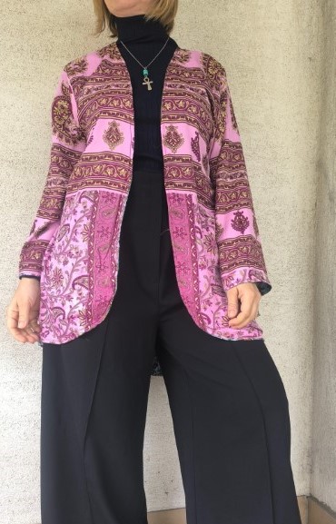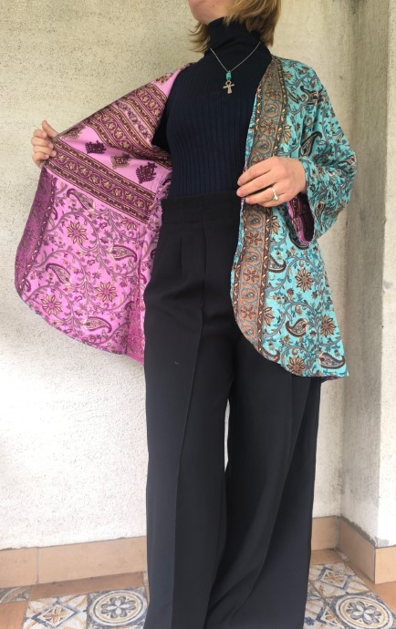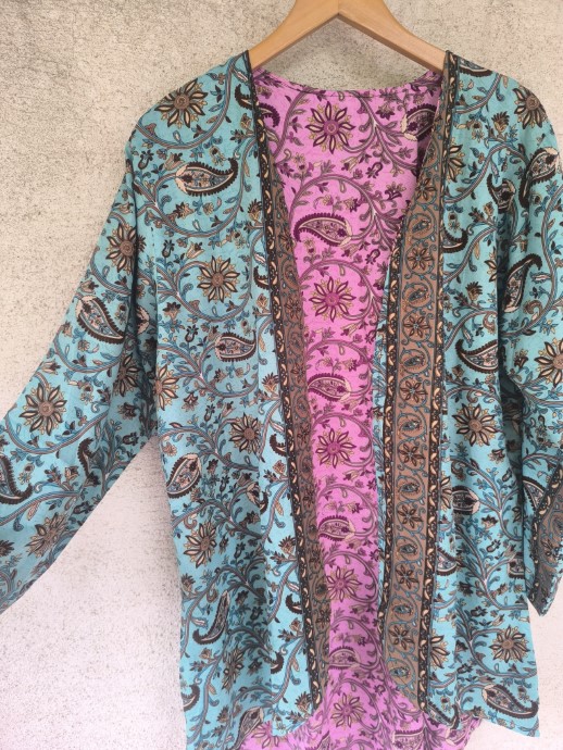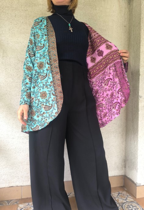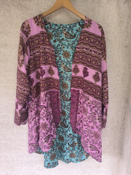 Kifordítható, combközépig érő száriból készült blézer, mely dupla anyagú, de nem alábélelt, háta kicsivel hosszabb. Őszre, tavaszra, irodába és még megannyi helyre tökéletes viselet.  Nagyon lágy, kellemes, könnyű újrahasznosított száriból készült, 100% viszkóz anyagú.