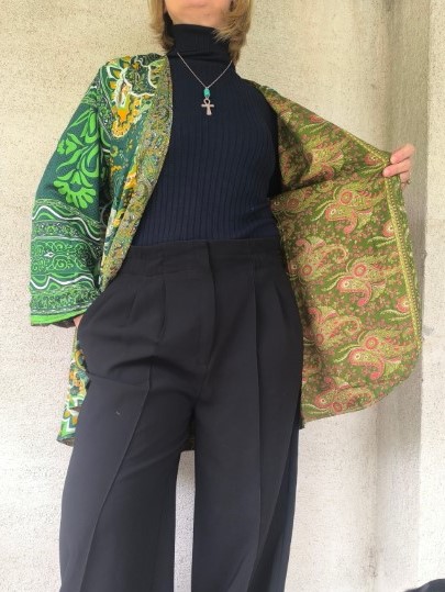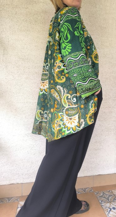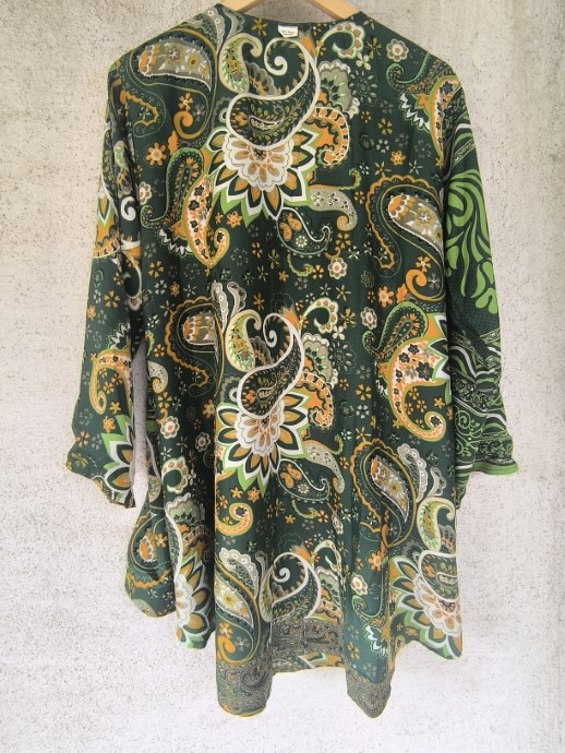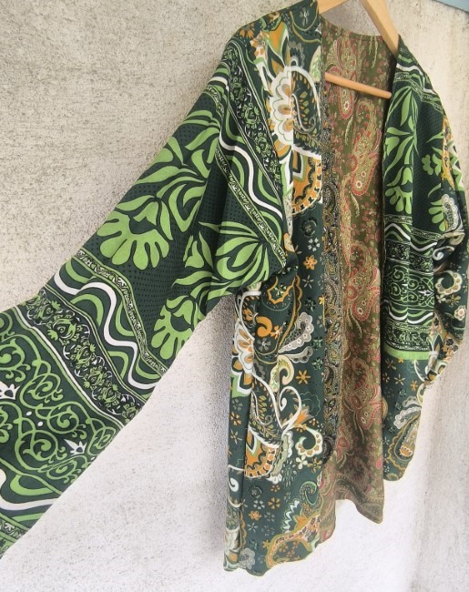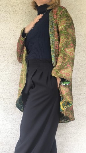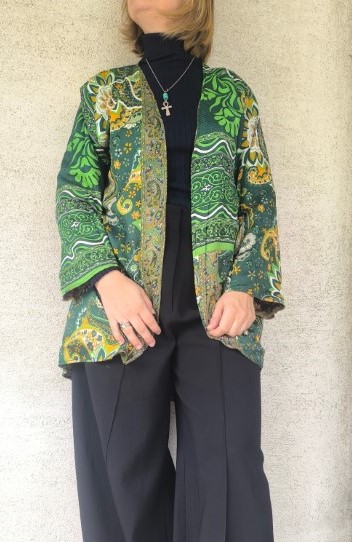 Kifordítható, combközépig érő száriból készült blézer. Dupla anyagú, de nem alábélelt, háta kicsivel hosszabb. Őszre, tavaszra, irodába és még megannyi helyre tökéletes viselet. Nagyon lágy, kellemes, könnyű újrahasznosított szárikból készülnek, 100% viszkóz anyagúak.