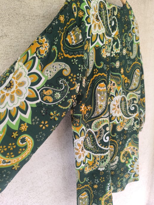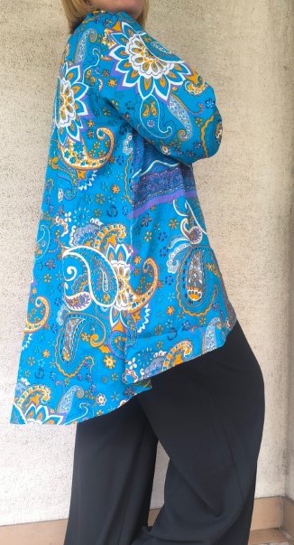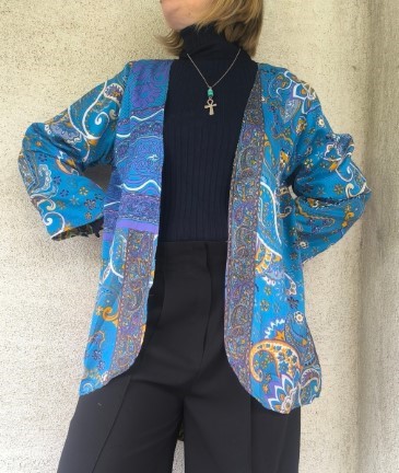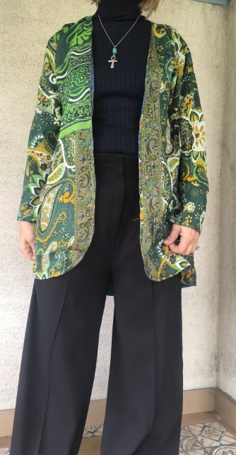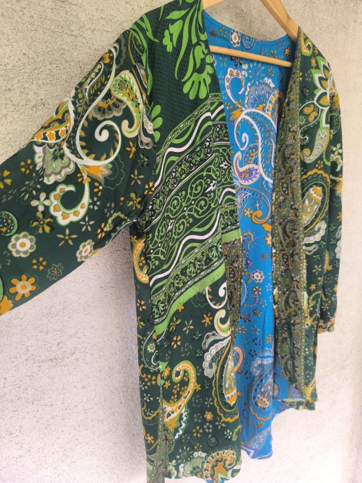 Kifordítható, combközépig érő száriból készült blézer, mely dupla anyagú, de nem alábélelt, háta kicsivel hosszabb. Őszre, tavaszra, irodába és még megannyi helyre tökéletes viselet.  Nagyon lágy, kellemes, könnyű újrahasznosított száriból készült, 100% viszkóz anyagú.