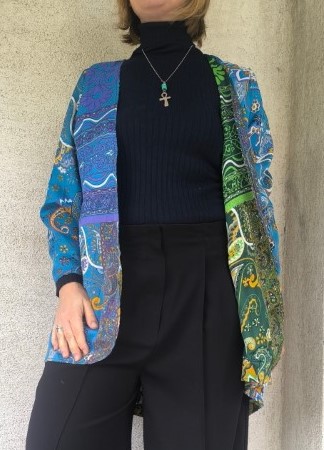 Kifordítható, combközépig érő száriból készült blézer. Dupla anyagú, de nem alábélelt, háta kicsivel hosszabb. Őszre, tavaszra, irodába és még megannyi helyre tökéletes viselet.  Nagyon lágy, kellemes, könnyű újrahasznosított szárikból készülnek, 100% viszkóz anyagúak.