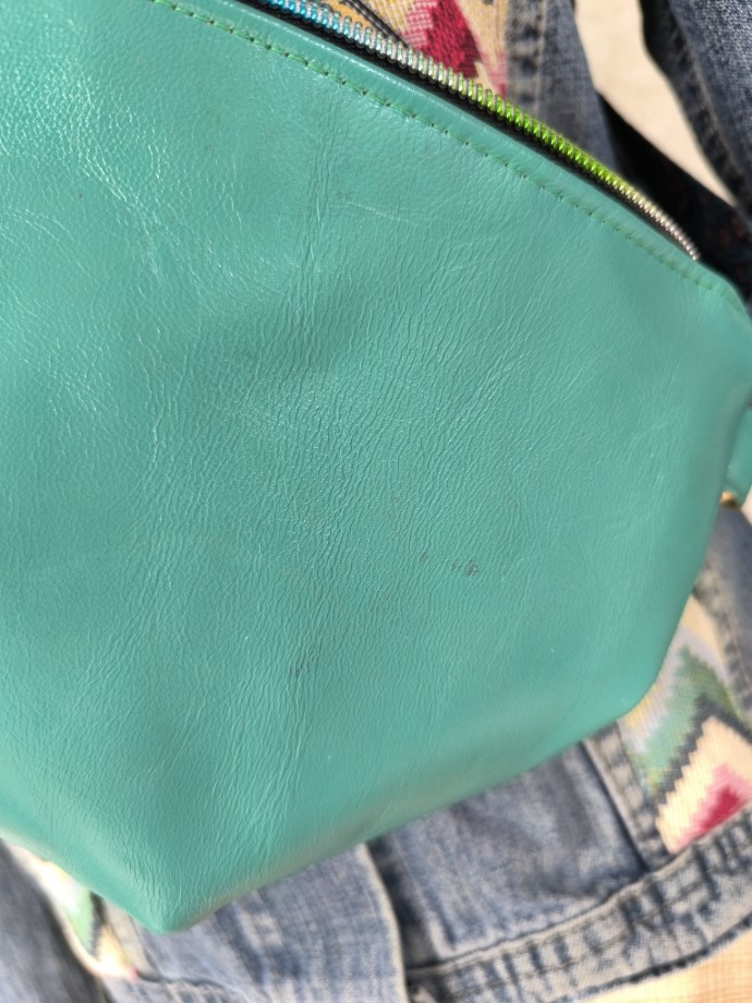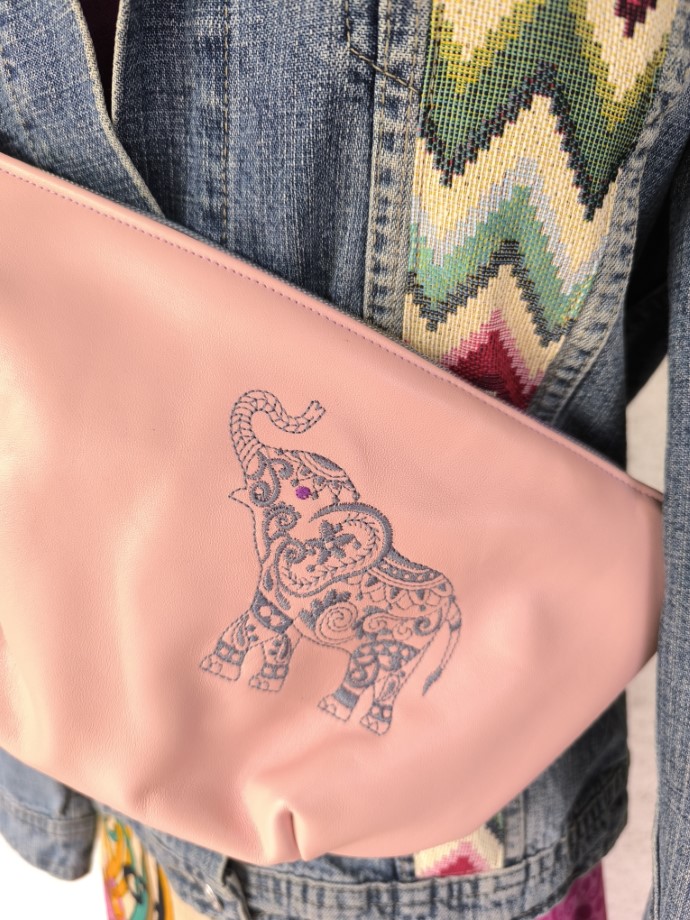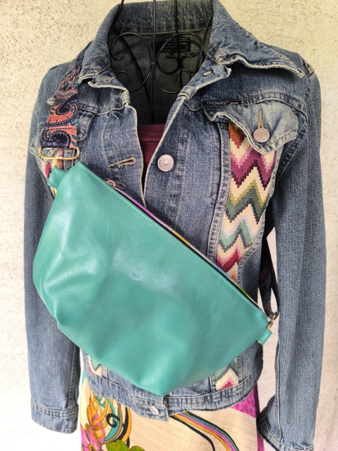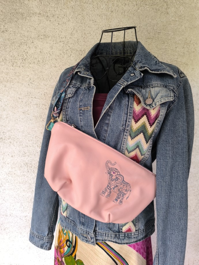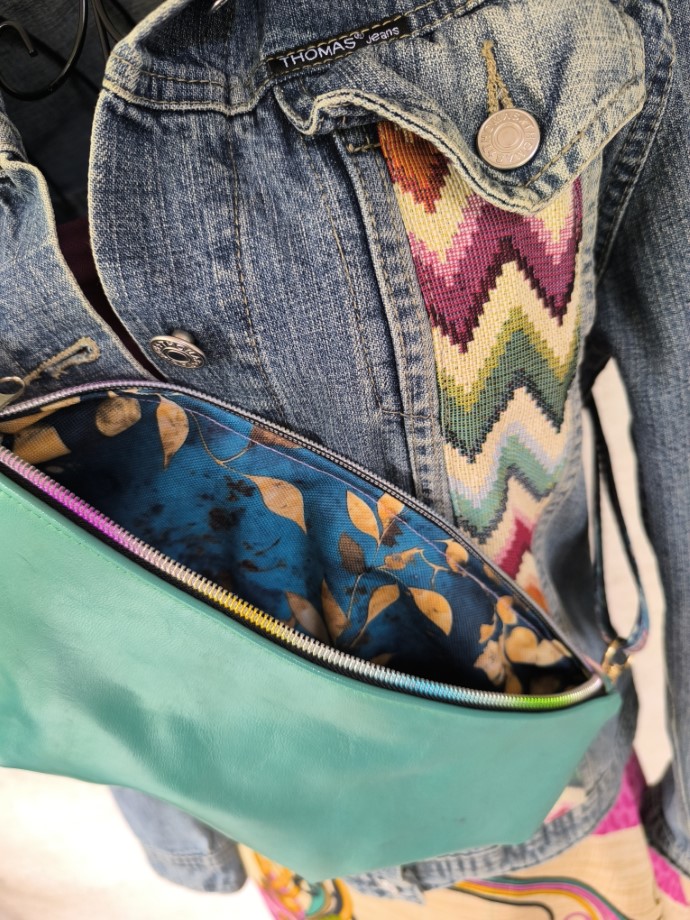 Bőr öv/kistáskánk természetes, színezett bőrből készült. Két oldala kölönböző színű. Cipzáras, belseje dekor vászon, kívül gépi hímzéssel kombinált. Pántja hossza állítható.