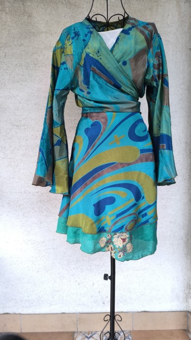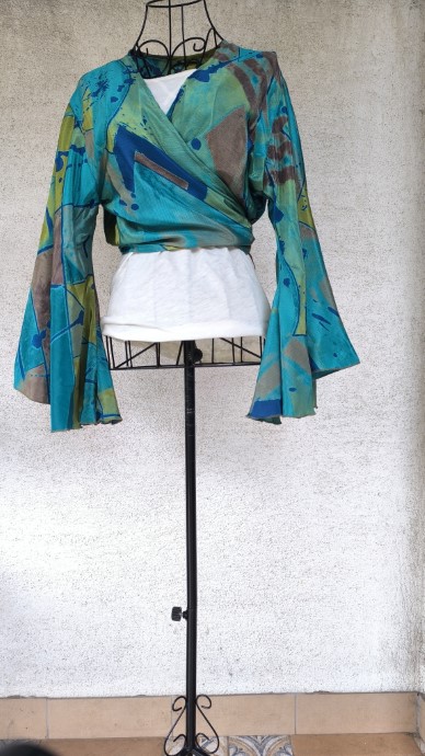 Átlapolós felsőink vintage száriból készültek. Mivel újrafelhasznált kézzel készültek, így mindegyikből egy darab készül.