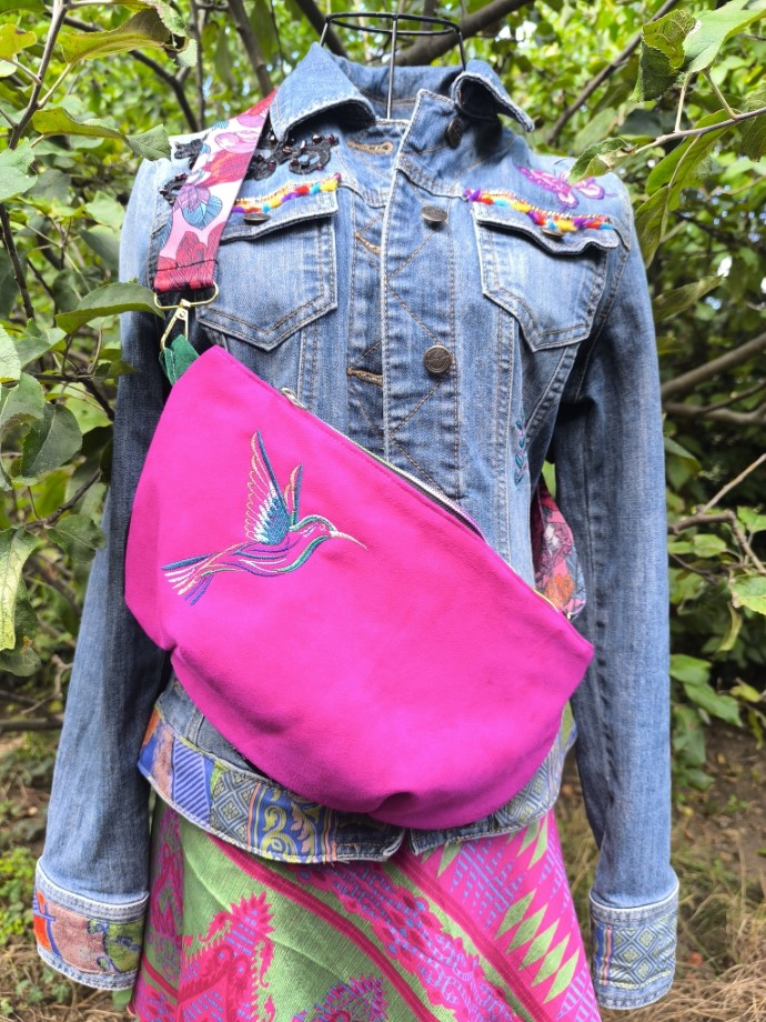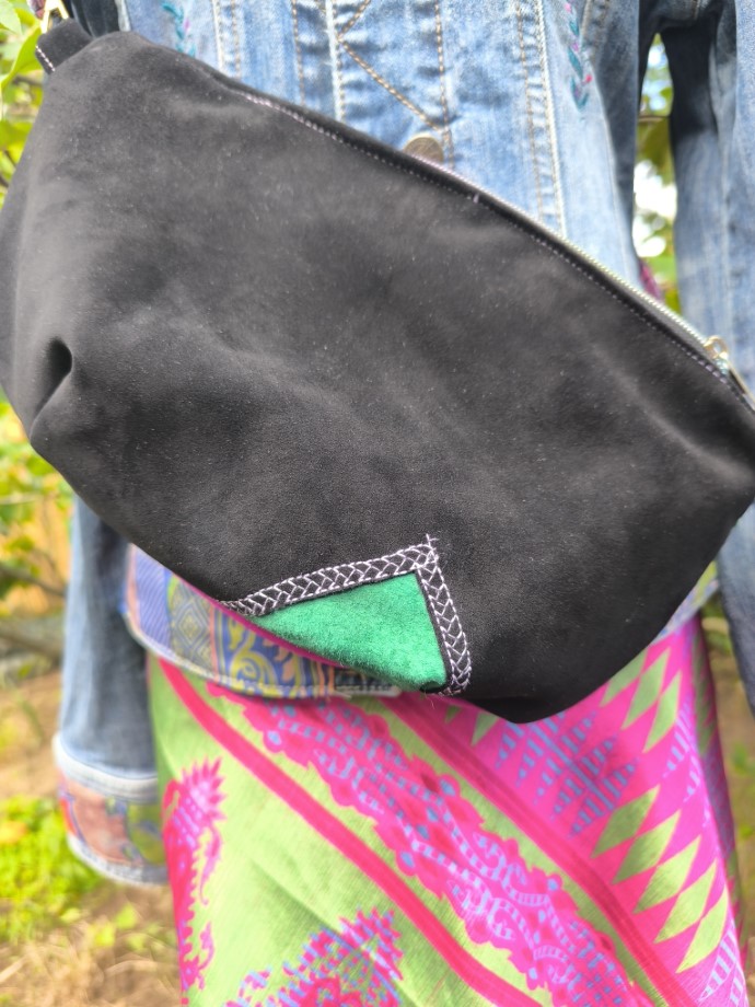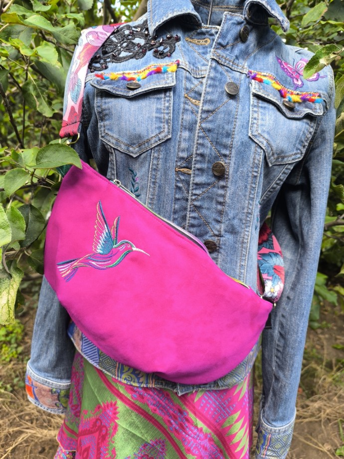 Bőr öv/kistáskánk természetes, színezett bőrből készült. Két oldala kölönböző színű. Cipzáras, belseje dekor vászon, kívül gépi hímzéssel kombinált. Pántja hossza állítható.
