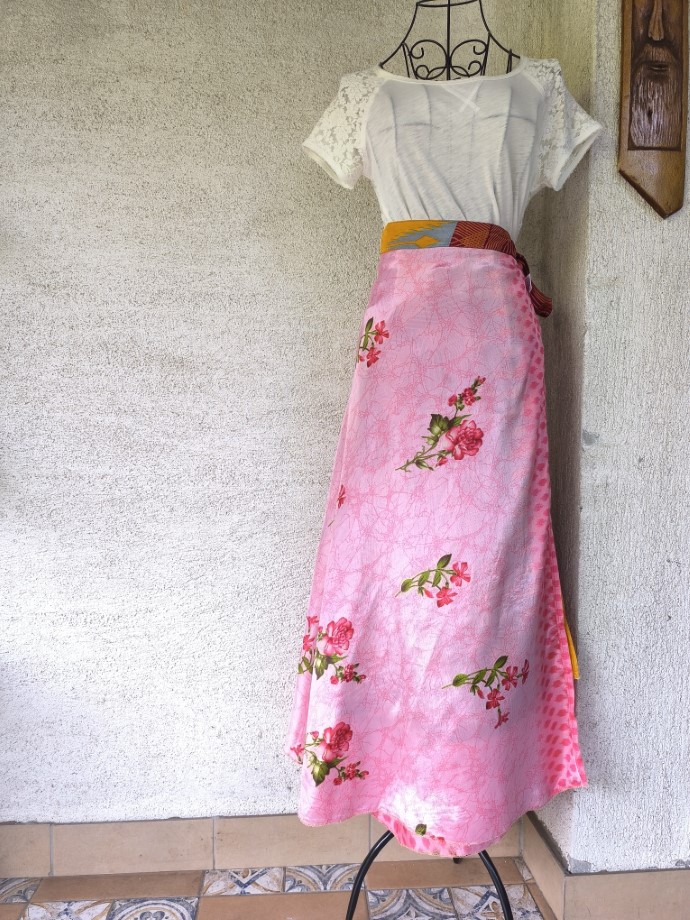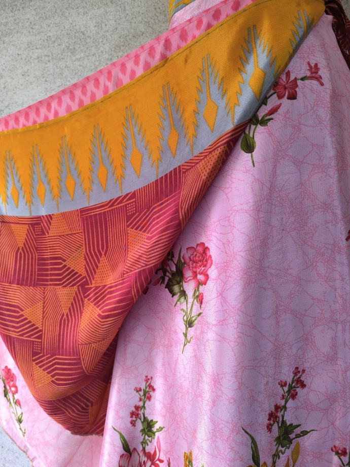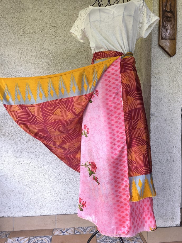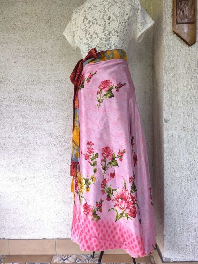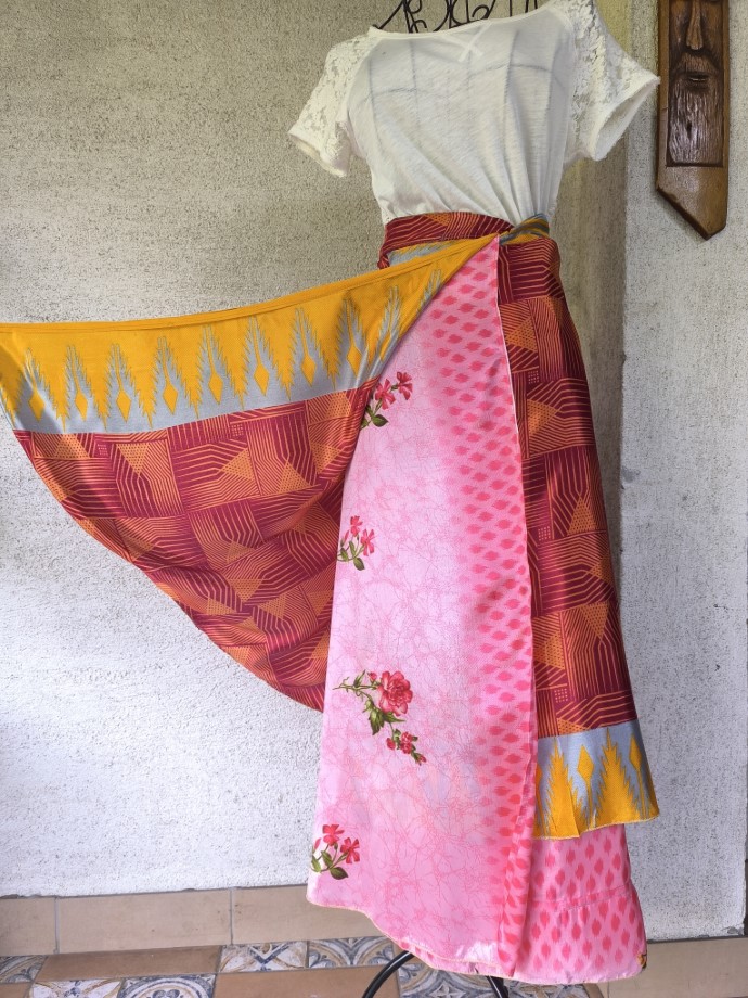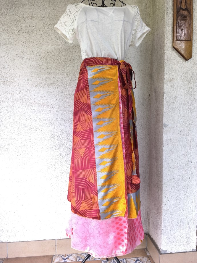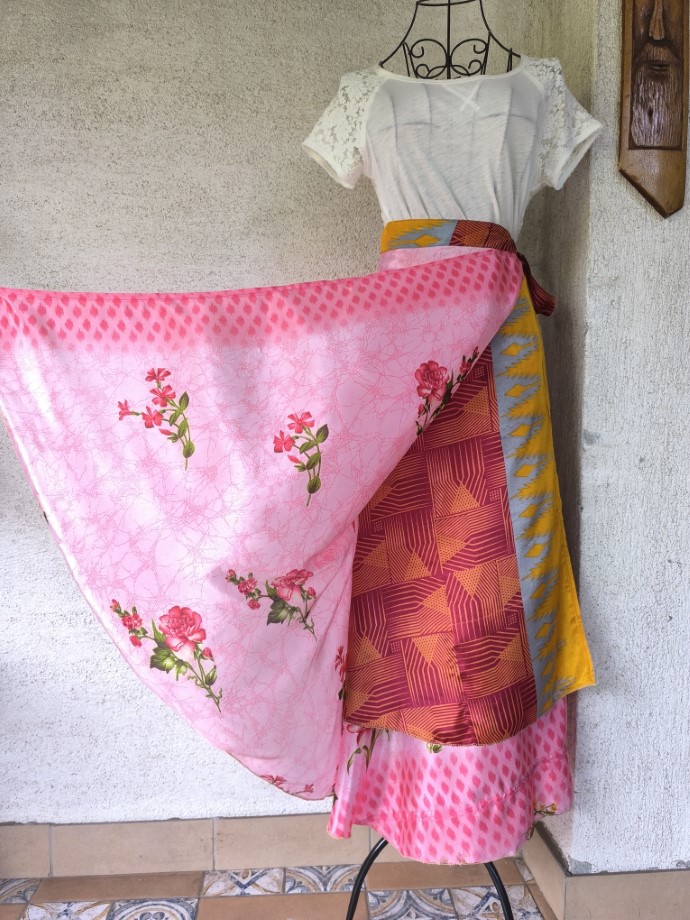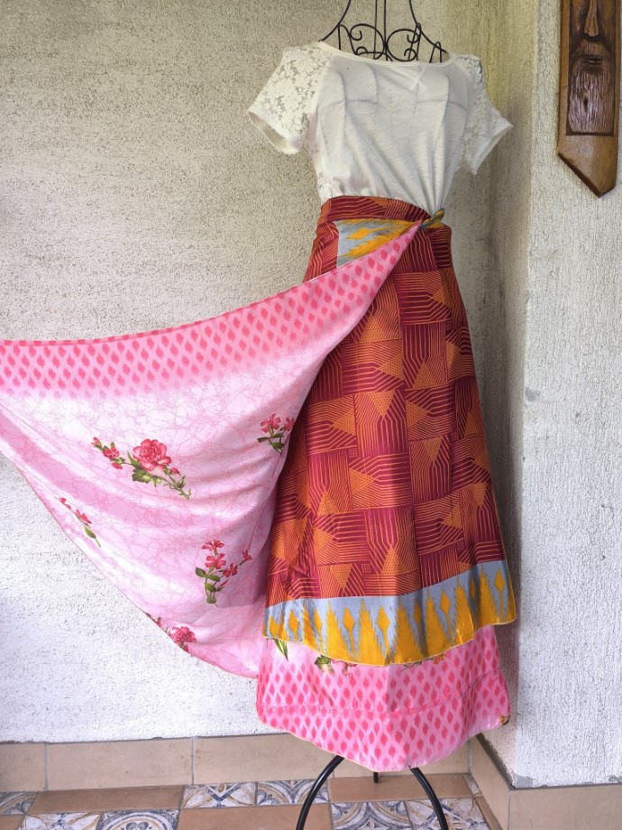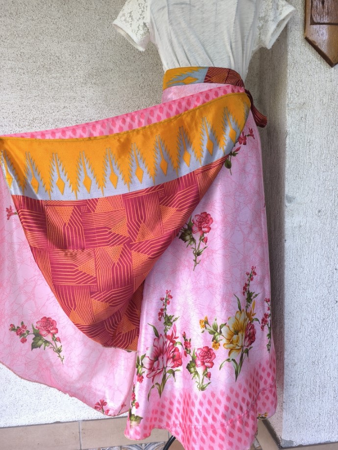 Szári szoknyáink újrahasznosított szárikból készülnek. Mindkét oldaluk hordható, kézzel készített darabok. Felköthetőek szoknyának vagy ruhának is.