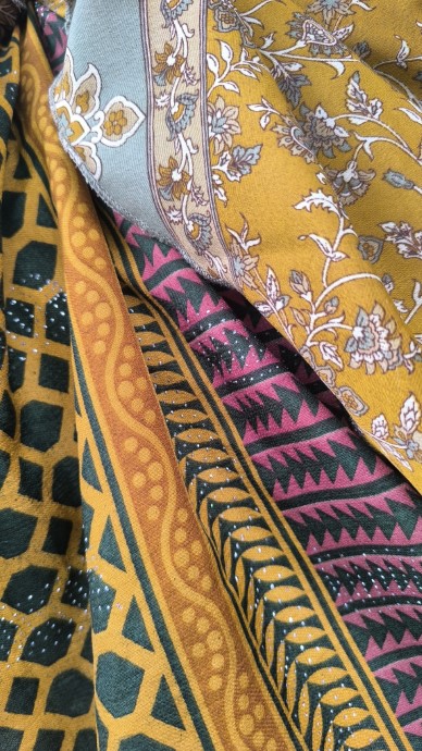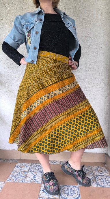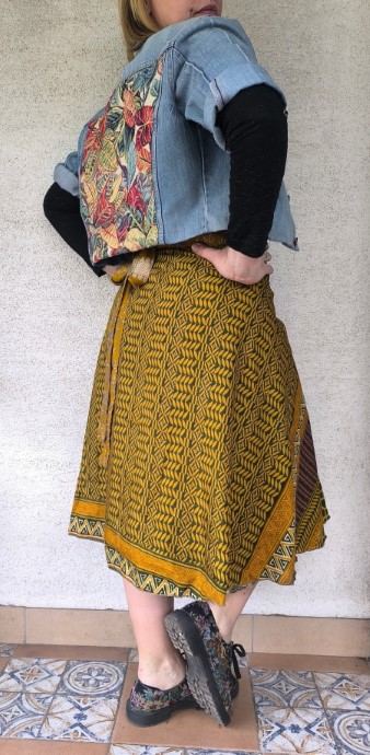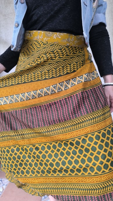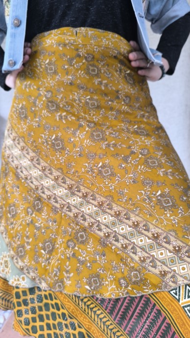 Mindkét oldala hordható, kézzel készített darabok. Felköthető szoknyának vagy ruhának.